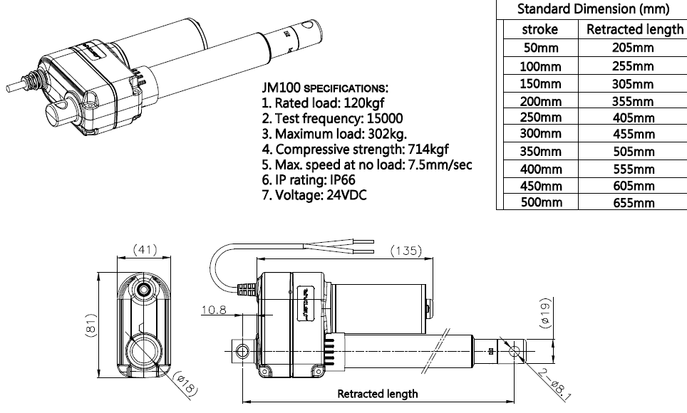 Model No.: JM100 Volts: 12V/24V DC Rated Amp.: 3.5A Max. thrust: 800N/1200N Duty: 1 Min ON / 9 Min OFF 結構緊湊、不佔用空間 行程客製化(若非標準行程可能產生費用) 支援防水IP54