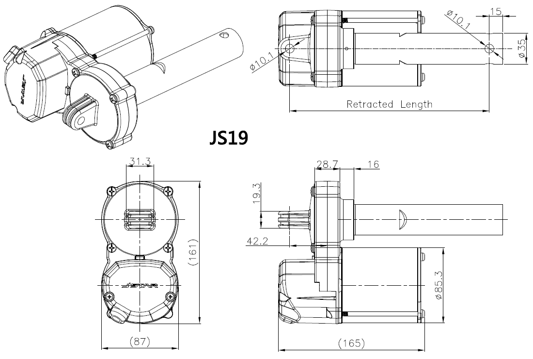Model No. : JS19 Volts : 110 / 220 VAC Frequency : 50 / 60Hz Max. thrust : 5800N Duty : 1 Min ON / 8 Min OFF 可客製化 支援霍爾開關 支援VR(可變電阻)控制 支援極限開關