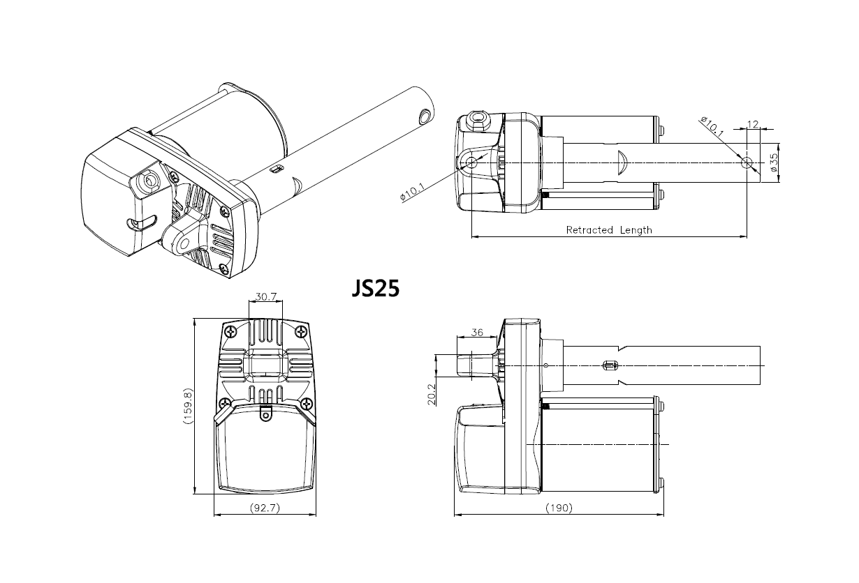 Model No. : JS25 Volts : 110 / 220 VAC Frequency : 50 / 60Hz Max. thrust : 5000N Duty : 1 Min ON / 8 Min OFF 可客製化 支援霍爾開關 支援VR(可變電阻)控制 支援極限開關