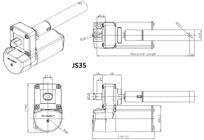 Model No. : JS35 Volts : 110 / 220 VAC Frequency : 50 / 60Hz Max. thrust : 7500N Duty : 1 Min ON / 8 Min OFF 可客製化 支援霍爾開關 支援VR(可變電阻)控制 支援極限開關